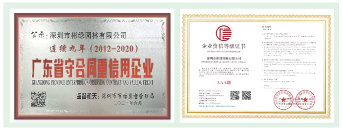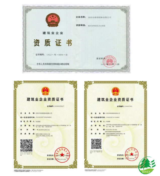 深圳市彬綠園林有限公司成立于2002年1月,注冊(cè)資金3908萬(wàn)元,具備園林綠化企業(yè)壹級(jí)資質(zhì)、建筑工程施工總承包二級(jí)、市政公用工程施工總承包二級(jí)、城市及道路照明工程專業(yè)承包二級(jí)、古建筑工程專業(yè)承包二級(jí)、造林工程施工乙級(jí)資質(zhì)、林業(yè)有害生物防治丙級(jí)資質(zhì)、林業(yè)有害生物監(jiān)理丙級(jí)資質(zhì)、林業(yè)調(diào)查規(guī)劃設(shè)計(jì)丙級(jí)資質(zhì)、造林綠化監(jiān)理丙級(jí)資質(zhì)、有害生物防制丙級(jí)資質(zhì)、病媒生物防治服務(wù)C級(jí)資質(zhì)、環(huán)衛(wèi)作業(yè)清潔服務(wù)丙級(jí)資格、白蟻防治丙級(jí)等企業(yè)資質(zhì)。公司集園林景觀工程設(shè)計(jì)、施工、花卉租擺、綠化養(yǎng)護(hù)、苗木銷售為一體,是一家綜合實(shí)力較強(qiáng)的專業(yè)生態(tài)景觀建設(shè)公司。