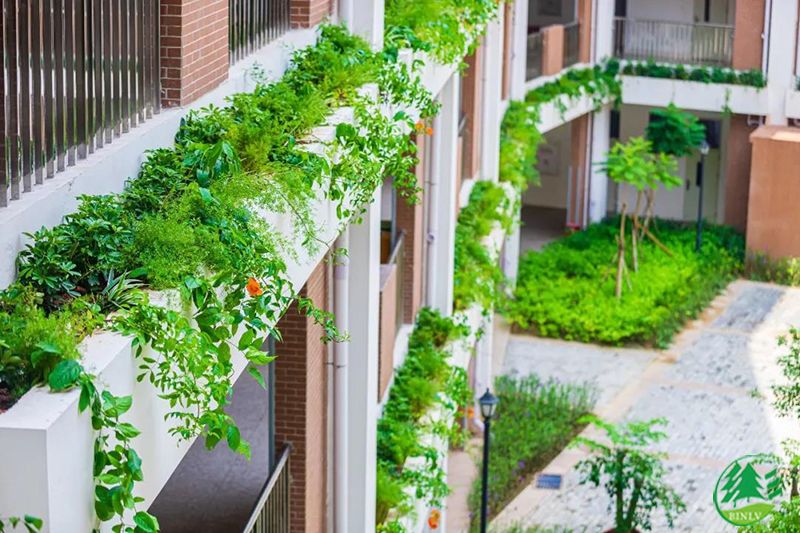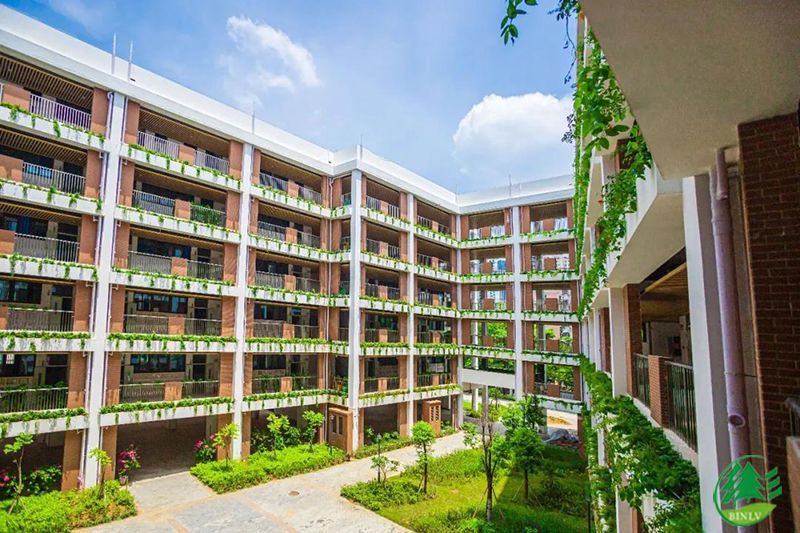 “枝繁葉茂”也象征著“勃勃生機”,而校園園林環(huán)境的打造不宜過“繁”,反而應當“化繁為簡”,在本工程的總體規(guī)劃中,植物配置的“簡”可謂恰到好處;廣場以整齊規(guī)劃排列為主,層次分明、級級向上的樹木令空間顯得格外靈動,樓層陽臺以簡潔的垂直綠化為主,二者貌似簡單,卻盡得奧妙。